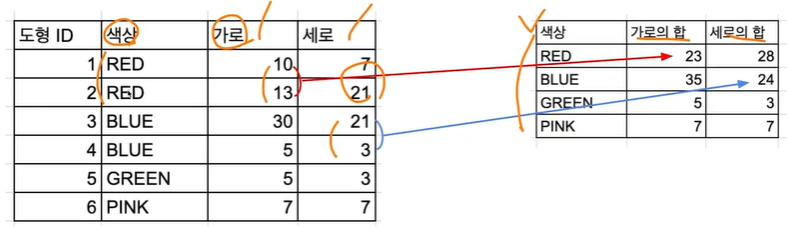 → 특정 칼럼을 기준으로 모으면서 다른 컬럼에서 집계 가능(합, 평균, MAX, MIN 등)