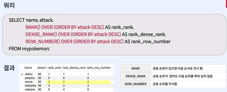 - RANK 데이터를 정렬해 순위를 만들어 주는 함수
