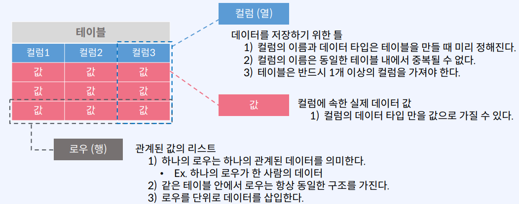 - 테이블 : 데이터베이스에서 데이터를 형태를 정해 모아 놓은 저장 공간 → 행과 열로 이루어진 데이터 표