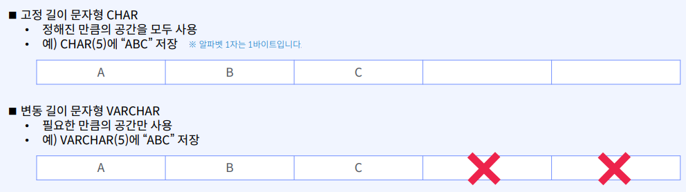 - VARCHAR(n) : 변동 길이로 문자열 저장