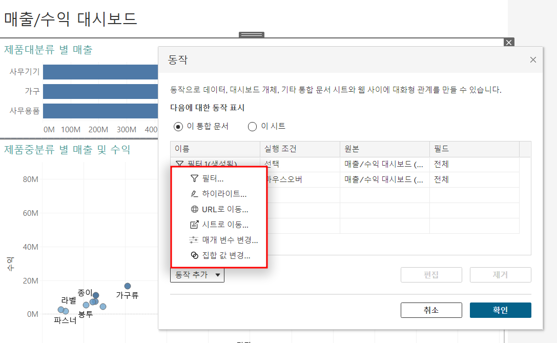 - 동작 추가 기능 : 필터, 하이라이트, url 이동, 시트 이동, 매개 변수 변경, 집합 값 변경